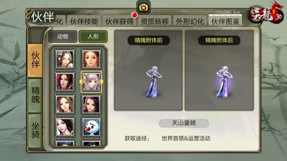 也便是人形的同伴,但其實天山、峨嵋和武當更適合選取動物類型同伴。人形-天山童姥:精魄附體後同伴外形也會隨之改動天山追求壹擊必殺,需求同伴彌補損傷。