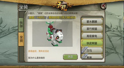兑换稀有道具更有全新铁皮熊猫坐骑等你来骑!萌酷机械,英俊无敌!黄沙百战穿金甲,不破楼兰终不还!天龙两岁,犒赏三军!玩家每天登录游戏或者参加组队副本即可取得【天龙令旗】。