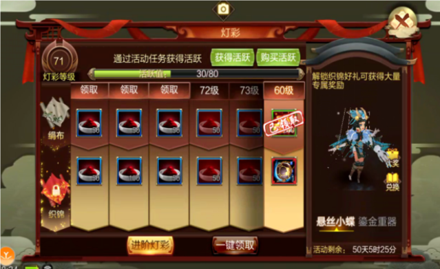 裝備、五行珠、同伴、遊歷四大獎賞模塊階梯式敞開!秘聞等級抵達50級即可收取【同伴自選禮包】【重樓精華】、【織錦禮券】、【很多邦定元寶】等心動獎賞。