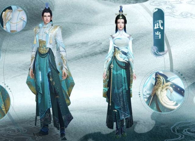 入門弟子首先要閱歷照己、觀心、悟道三重歷練,追求道法六合的境界。而入室弟子的考驗則愈加嚴苛,不僅要在武學修為上拔得頭籌,更要有兼濟天下的純善之心。 時裝整體環繞蒼松與靈鶴主題規劃,立體式裁剪更具有道家神韻。青白交錯的長袍製作長青松針紋,既彰顯武當派不入塵囂的清雅與空靈,也傑出入室弟子堅定不移、遵循道心的心境。 雙袖以金線縫製靈鶴蒼松紋理,又添一分超然脫俗的道家風骨。下裝海青色長衫與上衣形成撞色美感,似乎地脈清氣噴薄而出,儼然一片道法天然的和諧盛景。